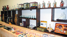 在義工廖秀鈴、廖麗琴精心布置下,物品由主次順序,從會場中心向四周依序擺放,新增的精緻佛像、色彩豔麗的手工藝品、吊飾,勢必能吸引遊客目光。