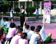 佛光緣美術館為推廣二十六日於佛光山寺舉辦的「兒童歡樂藝術節」活動,自八月十五日的說故事媽媽培訓課程後,便深入大樹鄉各國小校園,利用朝會時間解說「孫悟空大鬧天宮」的緣起,與玄奘大師取得《心經》的歷程。(人間社記者曾盈潔攝)
