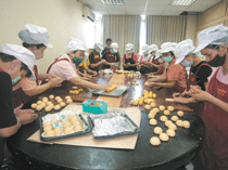 今年邁入第十一年的製餅經驗,使得講堂形成小規模的製餅工房。尤其,每天需以純手工製作方式,生產出上千盒的訂貨量,就連督導長鄭國棟等男眾也分批利用上班前來甩麵糰,義工的臉上,雖戴上口罩,仍掩不住內心讓萬粒餅傳達善心、結萬人緣的喜悅。