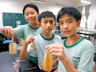 三人將冰棍放在鋁箔包果汁內,自製枝仔冰實驗,等果汁結凍,再撕開鋁箔包,吃到只剩一面,甩一甩,看是否冰還是否「黏」在冰棍上。每次實驗五組、十枝冰棒,最後發現,U型橫線那組效果最好。