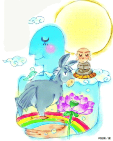 在禪的修行中,幽默亦是一種靜心養性之道。唐朝的趙州從諗,有一天和弟子文遠閒坐著。他說,「我們來比賽,看誰把自己比喻得更低,誰贏了,誰就輸掉那塊餅。」比賽開始,趙州說,「我是一隻驢。」文遠說,「我是驢屁股。」趙州說,「我是驢糞。」文遠說,「我是糞裡的蟲。」