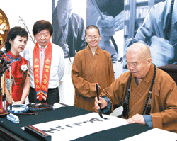 發大願心的大師,今年自九月底起四十天內共寫了七千幅字,「與人為善」、「三好之家」、「以空為有」等墨跡,字字飽含警世智慧、人生哲理。大師挑選一千二百幅巡迴世界展出,義賣籌募「公益信託星雲大師教育基金」,籌得的善款將贊助在南京大學建設教學大樓等公益建設。