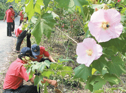潘英輝說,木芙蓉花形碩大不輸牡丹,而且色澤變化豐富,一天可從白色轉粉紅再變深紅,隊員在南坑二號產業道路種植了上千棵,不僅每天義務除草灌溉,還利用茭白筍殼覆蓋,既減少雜草叢生又保濕,非常環保。