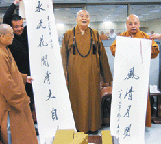 大陸河北省保定市佛教協會副會長暨保定寺真覺禪寺住持真廣法師一行十二人,昨日參訪台北道場拜會佛光山開山星雲大師,並贈送大師字畫。人間社記者陳秋玉攝