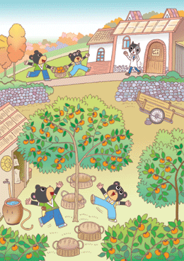 黑熊哥哥和黑熊弟弟在山上種了很多柿子樹,每年秋天的時候,是柿子成熟的季節,他們兄弟倆天天從早忙到晚,就是在採收柿子。