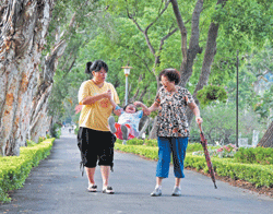 林蔭道上,娃娃快樂得要飛起來了,搭上祖孫的代間教育列車,三代共享天倫。蔡榮祥攝