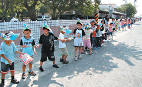 嘉義縣六腳鄉更寮國小七十三名小朋友,昨天以接力方式將五百本書搬進田寮村民活動中心,校方希望讓小朋友更懂得珍惜書本並養成閱讀習慣。 黃煌權攝