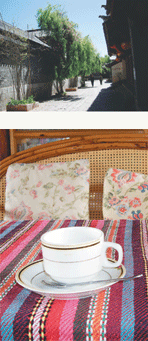 從四方街到萬古樓的頂端要四十分鐘,一路是爬坡,很費腳力。下山時,「兩只貓咖啡館」向我招手。這個咖啡館可以拍照,等咖啡上桌的空檔,拿著數位相機,四處取景。那無邊的山色,還有整排櫃子散出迷人的書香。麗江七日,只喝了兩杯咖啡,不為解癮,只為歇腳,只為和當地人說說話。