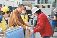 潮州講堂監寺妙喜法師、國際佛光會中華總會南區協會委員巫岱鐘與督導長林合勝,偕同潮州講堂所屬分會會員等十五人,攜帶三百套棉被、床墊等寢具用品抵達燄塭社區活動中心前,發放給村民。 (人間社記者王墩山攝)