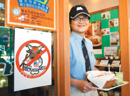 台北市昨天上午開始張貼首波「拒絕使用美國牛內臟、絞肉及脊髓自主管理聯盟」標章,摩斯漢堡是第一個「速食店類」的響應商家。鄭超文攝
