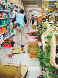 不耐強震搖晃,南投一家量販店架上的紅酒、醬油等商品掉落一地,味道撲鼻,賣場人員趕緊清理。張家樂攝
