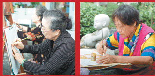 風徐來,陽光照,置身於殿宇旁、樹底下,坐在石椅上、花圃邊作畫的每一位長者,神情專注安詳如入定,彷如「樂以忘憂,不知老之將至。」