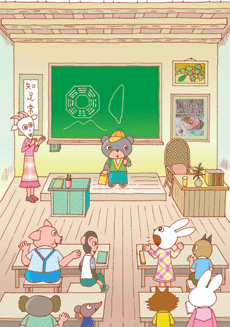 羊老師一進教室,就跟大家說:「各位同學,今天來了一位新朋友小灰熊,希望大家能夠好好相處,多多照顧他,現在我們一起拍手歡迎小灰熊!」「啪啪啪……。」「謝謝!」「好,我們請小灰熊說幾句話。」