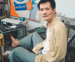 【本報龍井訊】台中縣龍井鄉有一名特別的電腦維修工程師林俊宏,因為年輕時意外失去雙手,靠著自己摸索學會電腦,現在不但開業、用「雙腳」為客戶維修電腦,還會開車!