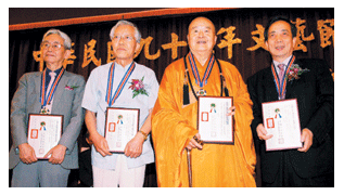 圖說:中國文藝協會昨天頒給(上圖左起)向明、朱炎、星雲大師、黃光男等人「榮譽文藝獎章」。記者邱麗玥攝