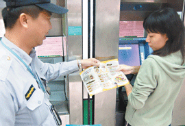 警方ATM站崗,遞送反詐騙手冊,不少民眾覺得很有安全感,但也反映不要只做「一天」,希望配合民防協勤人力,常態在深夜執行,對女性更有保障。熊迺群攝