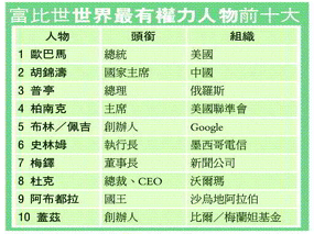 【本報綜合外電報導】美國《富比世》雜誌(Forbes)十一日公布歷來第一份「世界最有權力人物榜」,美中俄三國領袖分占前三名;美國聯邦準備理事會主席柏南奇位居第四,Google兩位創辦人排名第五。
