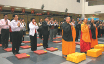 【人間社記者郭貴娟中壢報導】《人間福報》發行人暨國際佛光會中華總會總會長心定和尚十三日下午應中壢市長葉步樑之邀,除了於市公所禮堂為市府一級主管及各課室主管員工,進行「菩薩與義工」心靈講座外,更在演講前,為翻修後的市公所整棟大樓灑淨祈福。