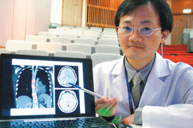 一名三十歲少婦,兩年前因持續咳嗽、出現白痰,到台中榮總進一步斷層掃描,醫師陳焜結發現,她脊椎第三節以下、腦部都出現癌細胞侵蝕的痕跡,證實已是肺癌第四期。喻文玟攝
