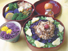五、滾水中,放鹽、少許油,放青花椰菜和四季豆,煮至變色後撈起,四季豆和紫地瓜分別切末,鋪於糙米飯上,中間挾上蜜汁芝麻核桃豆酥,綴上小赤梅,並將備好配菜裝盒即成。