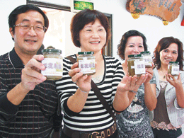 台南縣新化鎮清水社區理事長盧勝一(左一)推動農村手工產品,研發出獨特的「橄欖果醬」。吳淑玲攝