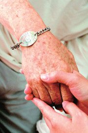 替失智老人配戴「愛心手鍊」,有效預防走失。陳立凱攝