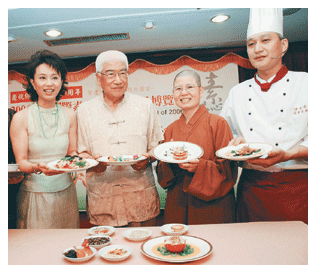 圖說:台北國際素食暨有機產品博覽會,昨天舉行展前記者會,邀請代言人孫翠鳳(左一)人間福報總主筆柴松林教授(左二)人間福報社長永芸法師(左三)蓮香齋名廚葛健雄,為大家說明素食的好處。記者邱麗玥攝