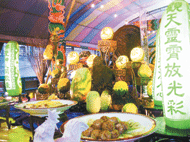 【記者郭書宏台北報導】台北縣蘆洲市湧蓮寺為慶祝改建三十周年,舉行「己丑年五朝福成圓醮」,祭典重頭戲「大普施」昨天登場,蔬果雕、米雕、千餘顆橘子組裝而成的柑仔龍等供品,吸引許多民眾觀賞、拍照,街頭熱鬧非凡,規模盛大歷年罕見。