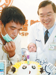 全台首例因新流感死亡的產婦所自然生下的早產兒蔡新生,彰基昨天為他辦出院歡送會,他睜大眼睛看著父親為他吹生日蛋糕蠟蠋。劉明岩攝