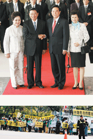 【本報台中訊】為「迎接」大陸海協會會長陳雲林,昨天上午海協會下榻的裕元飯店周圍聚集各種不同意見團體,有高喊「台灣中國、一邊一國」的綠營嗆聲群眾,也有抗議中共迫害的法輪功學員,還有拉布條支持江陳會、歡迎陳雲林到來的群眾。其中有人自稱是陳雲林的堂弟,企圖闖過上千警力圍成的防堵線。