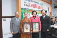 頒獎典禮後,這是新竹市長林政則卸任前重要行程,他特別向妙兆法師致意,感謝法寶寺與市政府合作,辦了多場利益大眾的講座,帶領佛光會長期認養三民公園,讓新竹市民有乾淨的活動空間,尤其每年法寶節分送數萬份臘八粥,給各機關團體及社區民眾,市長表達謝意。(人間社記者涂順龍攝)