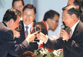 四次江陳會後,海基會董事長江丙坤(右)向海協會會長陳雲林(左)敬酒表達感謝,象微兩岸關係更進一步。曾吉松攝