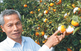 陳萬生本周起要陸續採收美女柑,由於最近天候冷熱交替,他為向陽的美女柑塗上一層白白的碳酸鈣隔絕日照,在園區形成特殊景觀。