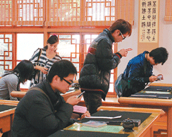 來到古色古香的抄經堂,學生們一打開門,都不禁「哇!」了一聲。用木頭鋪設的地板,陽光從窗櫺間灑落,在掛滿墨寶的屋子裡,每個人拿著剛抽到的《佛光菜根譚》法語,迫不及待地拿起相機「卡嚓、卡嚓」的拍了起來。