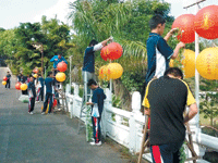 負責懸掛花燈的福誠高中、大寮國中同學則兩人一組,他們絕大多數都是運動好手,加上平時一起練習培養出默契,不到一小時,便把兩三百個花燈掛好。