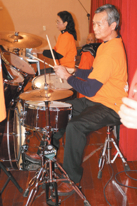 桃園縣平鎮樂齡資源學習中心譗樂齡八號豃二團的鼓手施能居(前),對抗鼻咽癌成功,但導致舌頭萎縮,只能用氣音說話,他透過打鼓傳達對生命的珍惜。楊德宜攝