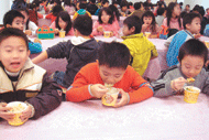 成福國小校長林朝枝也帶三百餘位師生到寺結善緣,三年級周弘翔嚐了兩口跟老師反映:「臘八粥好好吃哦!我要吃三碗。」(人間社記者鄭秋月攝)