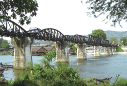 槍聲似乎很快就響起,在橋的弧形撐起了泰國的天空時,許多勇士以血塗寫著日記……陳舊而簡陋的紀念館中,被釘在牆上,關於桂河的褪色照片,已聞不到血腥的味道,但是,槍聲的驚嚇,卻那麼輕易而強烈控制遊客整個心靈。
