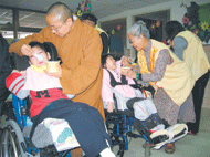 十八日監寺妙全法師法師帶領數十位佛光人,前往各機關、慈善單位致送臘八粥。到了畢士大教養院,妙全法師介紹臘八粥的緣起,並帶領佛光人一一餵食孩童,佛光人的慈悲善舉溫暖孩童心房,一旁的人無不深受感動。(圖/月光寺提供)