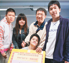 台中特殊教育學校腦性麻痺考生王新惟(坐者),師生組成「九九學測美麗相遇後援會」加油團,幫她打氣。喻文玟攝