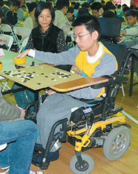【本報斗六訊】罹患肌肉萎縮症的總統教育獎得主陳祐明,學圍棋一年半,昨天參加二○一○全國主委盃圍棋公開賽,連戰五場,順利晉級四段棋手;他高興地向全天陪賽的媽媽戴惠珠說,「我有獎金,可以補貼一點參賽費!」