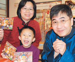 王一明(右)與梅子帶兒子,向大家拜年。李青霖攝
