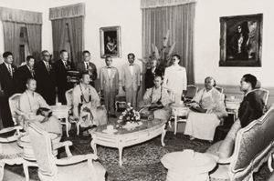 1963年,泰皇蒲美蓬(右一)在皇宮宴請「中華民國佛教訪問團」,圖坐者左起:白聖、賢頓、星雲大師、淨心等法師。