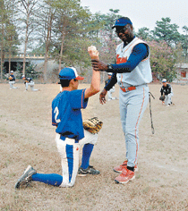 美國棒球大使貝瑞拉金(右)指導屏東縣棒球隊學生投球的姿勢。劉星君攝
