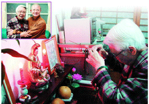 每天清晨,熊愷奶奶都會在佛堂前誦《金剛經》,一天至少唸阿彌陀佛佛號兩小時。奶奶從小喜歡運動,擅長太極拳的她還當過體育老師;即使年屆百歲,還是每天唸經,並且以平靜的心,嘗試用手慢慢地按摩穴道,從揉耳朵、訓練眼球動作、拍頭頂,到甩手、跺腳,在學佛與運動的雙管齊下,不僅紅光滿面,連假牙也派不上用場。(記者李祖翔攝)