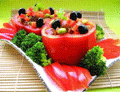 一、紅甜椒洗淨去蒂頭,再橫切成二,去籽後,底部當聚寶盆放盤中,尖頭部分一個半切條,排於盤子外圍,少部分切丁備用。
