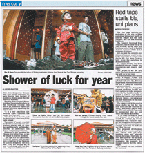 【人間社記者羅晴臥龍崗報導】澳洲Illawarra Mercury報紙十五日以「Shower of luck for year」為題,報導佛光山南天寺農曆新年慶祝活動的盛況;年初一,天降甘露仍吸引三萬兩千多名廣大民眾歡慶中國年節,各色雨傘下盡是燦爛笑臉,濃濃新春氣氛遍布寺院每一個角落。