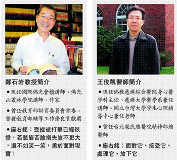 【記者郭書宏專題報導】台灣民眾愈來愈憂鬱!據保守統計,國內約有一百多萬的民眾正籠罩在憂鬱情緒之下。憂鬱症不但可治療,更可從生活中預防!本周《轉念看世間》專題,特別邀請國際佛光會檀講師鄭石岩教授,及佛教慈濟綜合醫院身心醫學科主任王俊凱醫師,就心理輔導與醫學角度,告訴讀者該如何在生活中遠離憂鬱,且協助有情緒困擾的朋友走出陰霾。