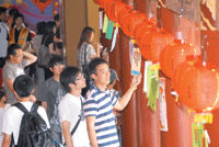 文化走廊計有逾百題有趣燈謎,題目包含國家地名、佛教名相、日常用品及水果花卉,更設有英文燈謎與當地朋友同樂;上午不到十時已有許多民眾手持謎題躍躍欲試,大家抓頭皺眉、摸臉思索、輕語討論,努力回答題目,答對題時銅鑼聲不時噹噹作響,圍觀人潮更擠得文化走廊水泄不通,現場答對者可參加「左手一撈」及幸運抽獎活動,只見民眾皆不計形象用左手撈走飲料、零食及玩具,歡喜氣氛逗得現場圍觀者喝采叫好。(人間社記者陳昭良攝)