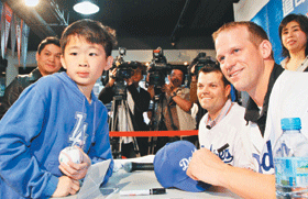某運動用品廠商與大聯盟球員工會(MLBPA)合作,昨天上午在西門町舉行簽名會。兩名選手限量只能為一百名球迷簽名,現場卻有逾二百名球迷排隊等候,道奇旋風可見一斑。